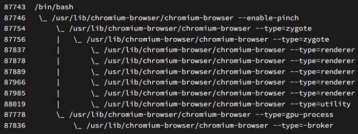 با توجه به تصویر 1، با این که صرفا یک نمونه از فایرفاکس در حال اجراست، بیش از چند پروسه توسط مرورگر ایجاد شده است. در لینوکس نیز با استفاده از دستور ps fx، میتوان این سلسله مراتب را مشاهده کرد (تصویر 2).