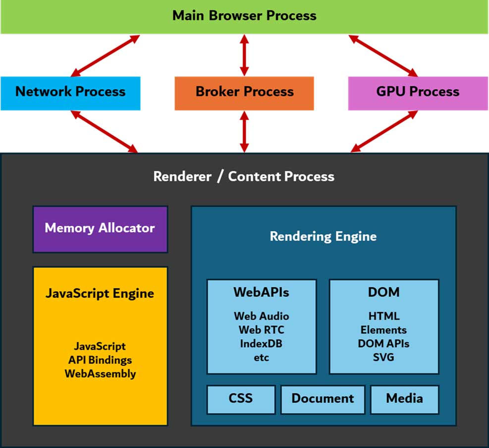 مرورگر را میتوان به دو بخش بروکر (Broker) و رندرر (Renderer) تقسیم کرد. این جداسازی منطقی بین بروکر و رندرر، یک کرانه امنیتی (Security boundary) نیز محسوب میشود. ذاتاً رندرر باید دادههای HTML و جاوااسکریپت دلخواه و غیرقابل اعتماد را پردازش کند که هر دو بهصورت بالقوه دارای پیچیدگی هستند. به همین دلیل، بخش عمدهی آسیبپذیریها در رندرر متمرکز خواهند بود. معمولا فرایند اکسپلویت کردن این آسیبپذیریها، به این صورت است که محتوای وب طراحیشدهی بخصوصی نوشته میشود، تا باگهای درون رندرر تریگر شوند، و سپس از این باگها برای اعمالی مانند اجرای کد از راهدور (Remote Code Execution) استفاده میشود.