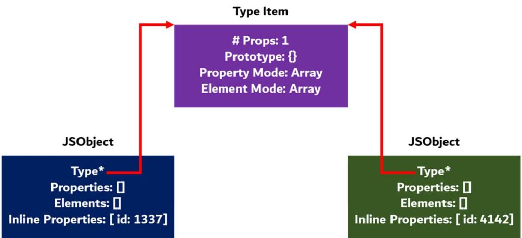 به این صورت، هر آبجکت اطلاعات Type یکسانی را به اشتراک میگذارد، بنابراین لازم نیست که هر کدام یک کپی از آن را همراه داشته باشند. علاوه بر این، از آنجا که اکثر آبجکتها دارای تعداد نسبتا کمی Property هستند، میتوان با ذخیرهسازی Propertyها بهصورت آرایه، هم در زمان و هم در فضا صرفهجویی کرد.