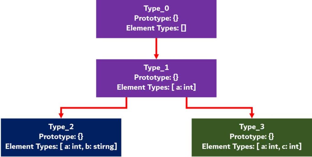 ممکن است صحبت درباره “نوع” در این زمینه عجیب به نظر برسد، زیرا از دید برنامهنویس، جاوا اسکریپت به اصطلاح یک زبان weekly typed است، اما در لایههای پایین، موتور همچنان پیگیر این است که هر آبجکت از چه نوعی میباشد. حال ممکن است این سوال پیش بیاید که در صورت ایجاد یک آبجکت جدید، موتور چگونه نوع مناسب را به آن اختصاص میدهد.