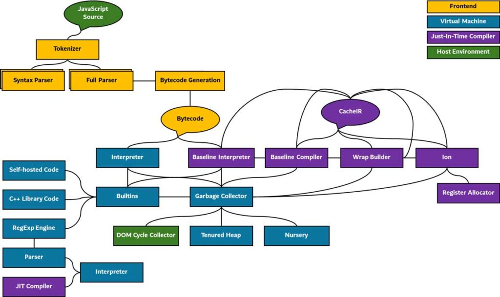 معماری اسپایدرمانکی عمدتا با زبان C/C++ پیادهسازی شده است و ادغام فزایندهای از Rust و جاوااسکریپت برای اجزای مختلف دارد. این رویکرد چندزبانه منعکسکننده یک استراتژی توسعه مدرن است که عملکرد خام (مانند C++)، ایمنی حافظه و مزایای همزمانی (مانند Rust) و قابلیتهای تکرار سریع یا خودمیزبانی (جاوااسکریپت) را بهطور متعادل استفاده میکند. هسته موتور شامل یک مفسر سریع، یک سیستم کامپایل در لحظه (Just In-Time – JIT) چندسطحی و یک زبالهروب (Garbage Collector) قدرتمند است. این ترکیب از یک مفسر، کامپایلرهای JIT و یک زبالهر وب، در حالی که همزمان حافظه را بهطور خودکار مدیریت میکند، نشاندهنده طراحی بهینهشده برای سرعت اجرای اولیه و عملکرد پایدار بلندمدت است. موتور اسپایدرمانکی همچنین میتواند بهعنوان یک شل (Shell) جاوااسکریپت مستقل اجرا شود که توسعه تعاملی و اجرای فایلهای جاوااسکریپت از طریق خط فرمان را تسهیل میکند. در دسترس بودن این شل ابزاری حیاتی برای توسعهدهندگانی است که روی خود موتور کار میکنند. این قابلیت، تست سریع، دیباگ و بررسی عملکرد را بهصورت مجزا و بدون سربار یا پیچیدگیهای یک محیط مرورگر کامل، امکانپذیر میسازد. ساختار کلی موتور اسپایدرمانکی در تصویر زیر قابل مشاهده است.