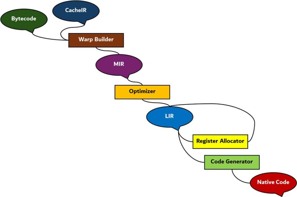 - WarpBuilder: این بخش خارج از ترد اصلی عمل کرده و با استفاده از آن اسنپشات، نمایش Ion MIR (Mid-level Intermediate Representation) را میسازد. این فرآیند در واقع یک ترجمه ماشینی است، به این معنی که دستورالعملهای CacheIR را به طور مستقیم به دستورالعملهای معادل در MIR تبدیل میکند.
