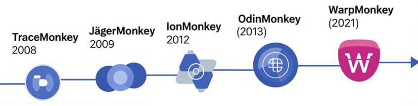 - BaldrMonkey (همان WASM-Ion در اسپایدرمانکی): برای اجرای WASM با بهینهسازی بالا، این موتور ورودی WASM را به همان فرم Ion MIR که توسط WarpMonkey استفاده میشود، ترجمه میکند. سپس از IonBackend جهت بهینهسازیهای پیشرفته، از جمله تخصیص رجیستر، برای تولید کد اختصاصی ماشین استفاده میکند. ادغام وباسمبلی که از زیرساخت JIT موجود (Ion MIR/LIR) استفاده مجدد میکند، اسپایدرمانکی را بهعنوان یک محیط اجرایی با کارایی بالا برای کدهای غیر جاوااسکریپتی در محیط وب مطرح میسازد.